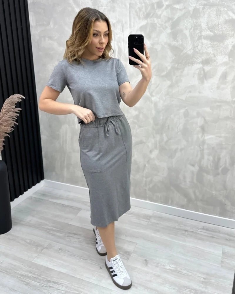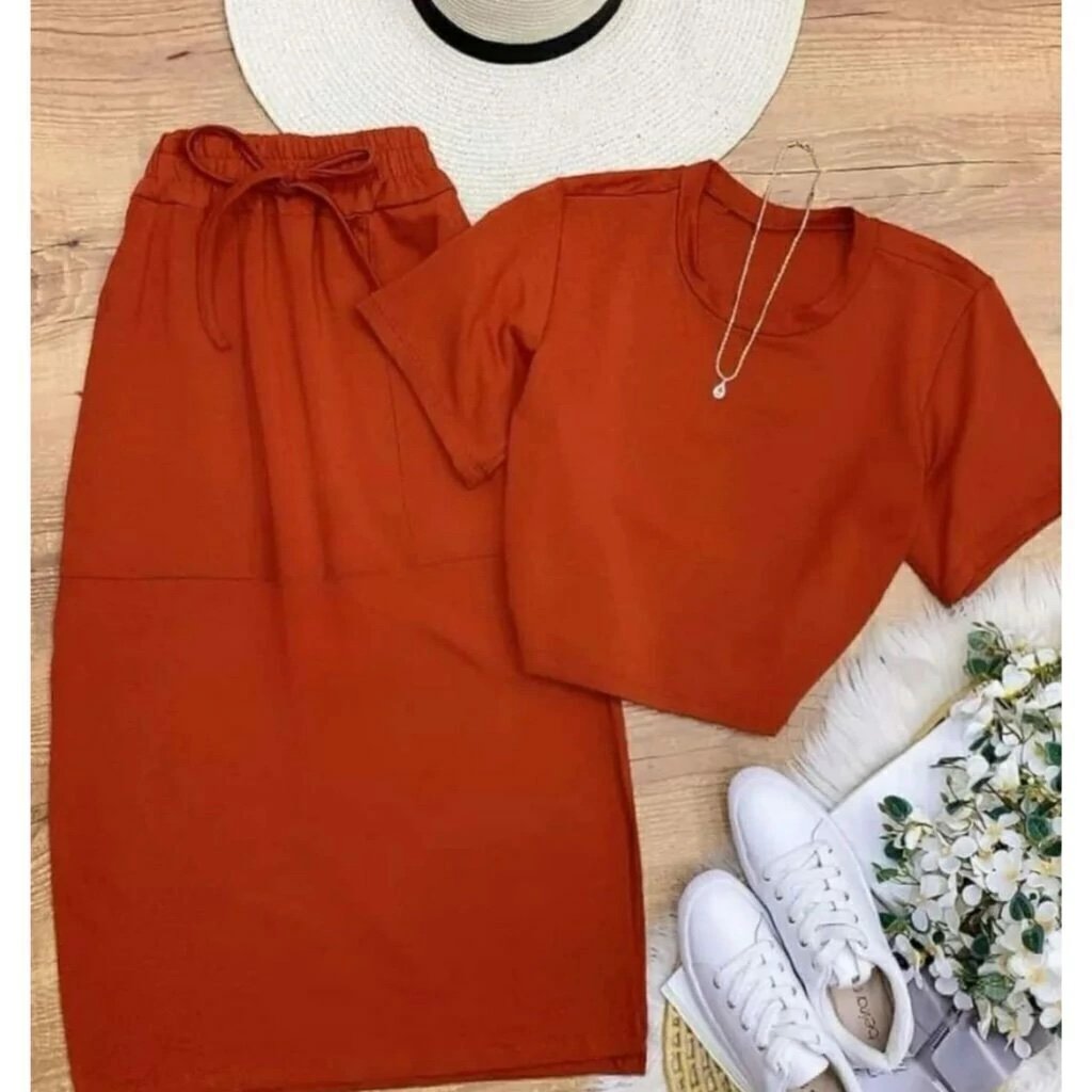 502 Conjunto Jasmin blusa t-shirt manga curta e calça estilo jogger suede