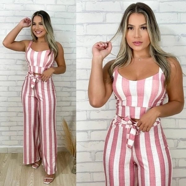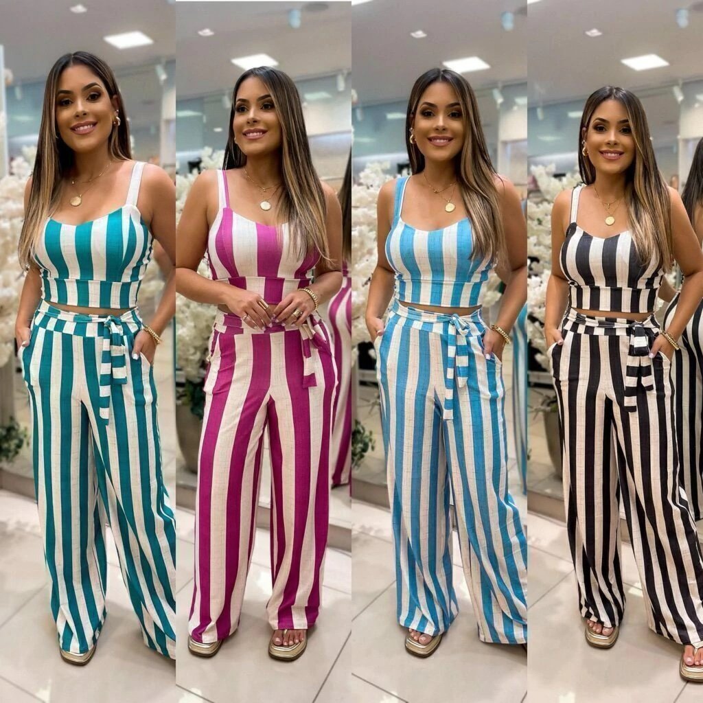2801 Conjunto Aline blusa cropped manga curta e calça pantalona listra lateral moletom