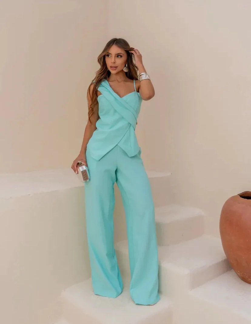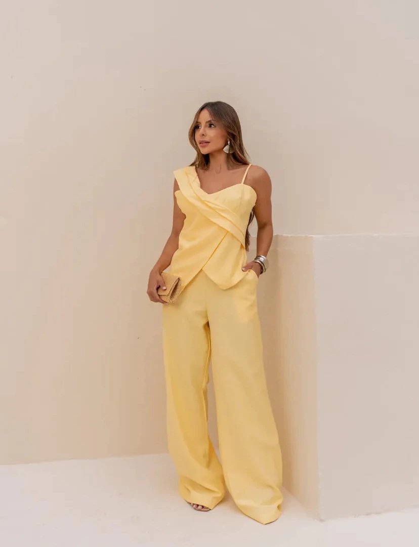 Conjunto Anny blusa regata alça fina alongada botão e calça pantalona alfaiataria