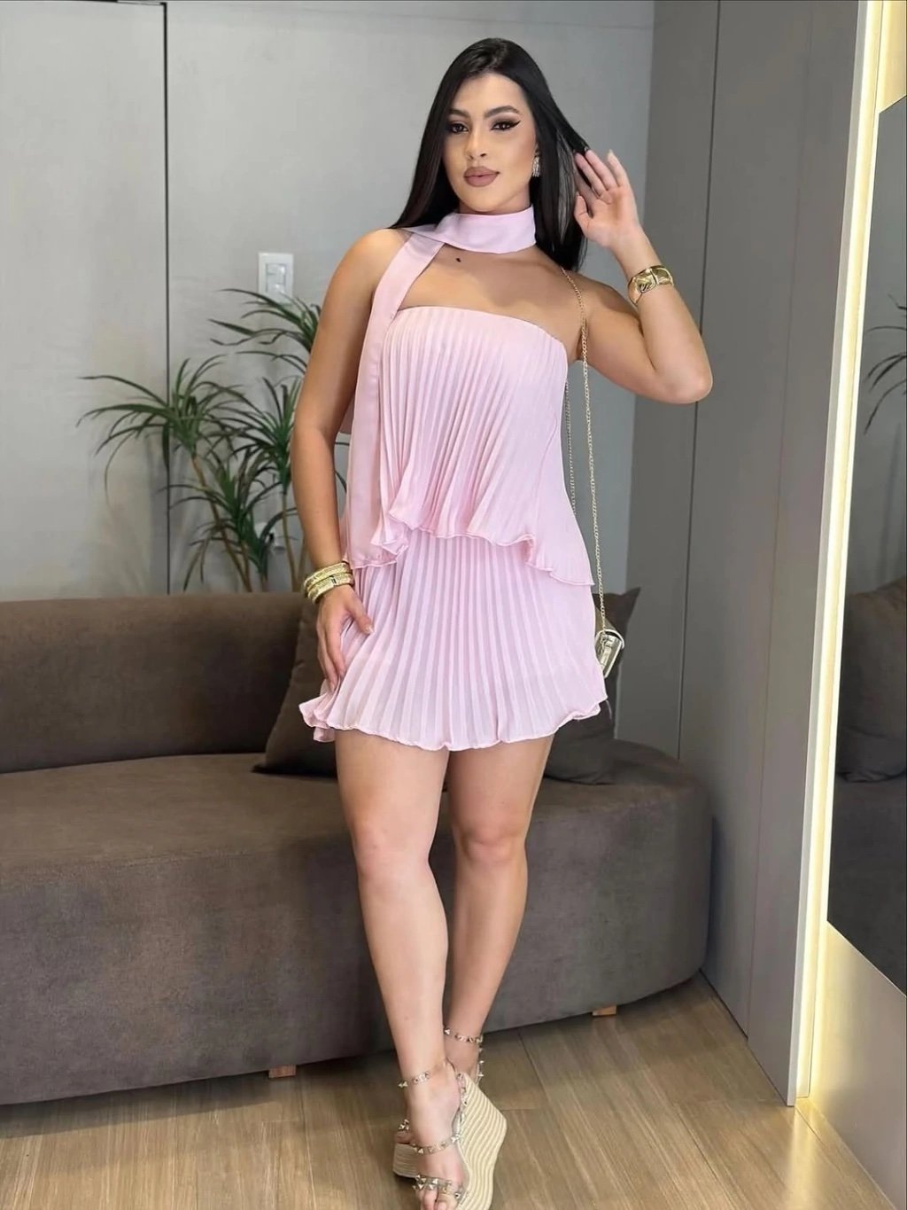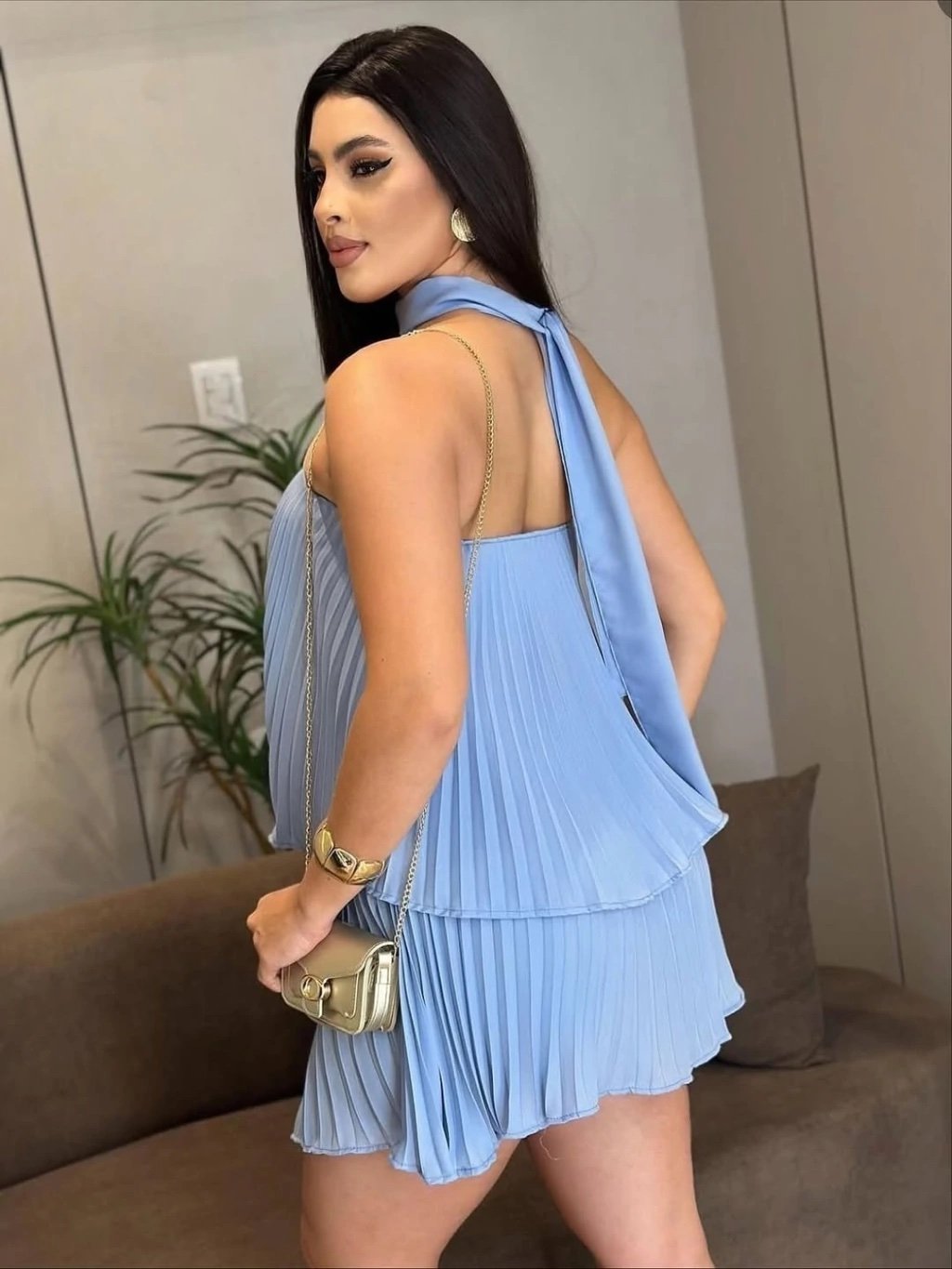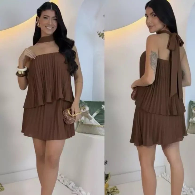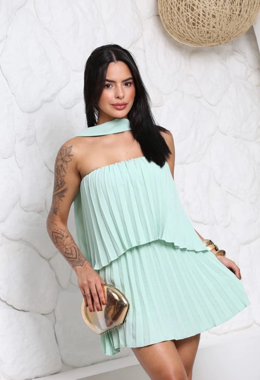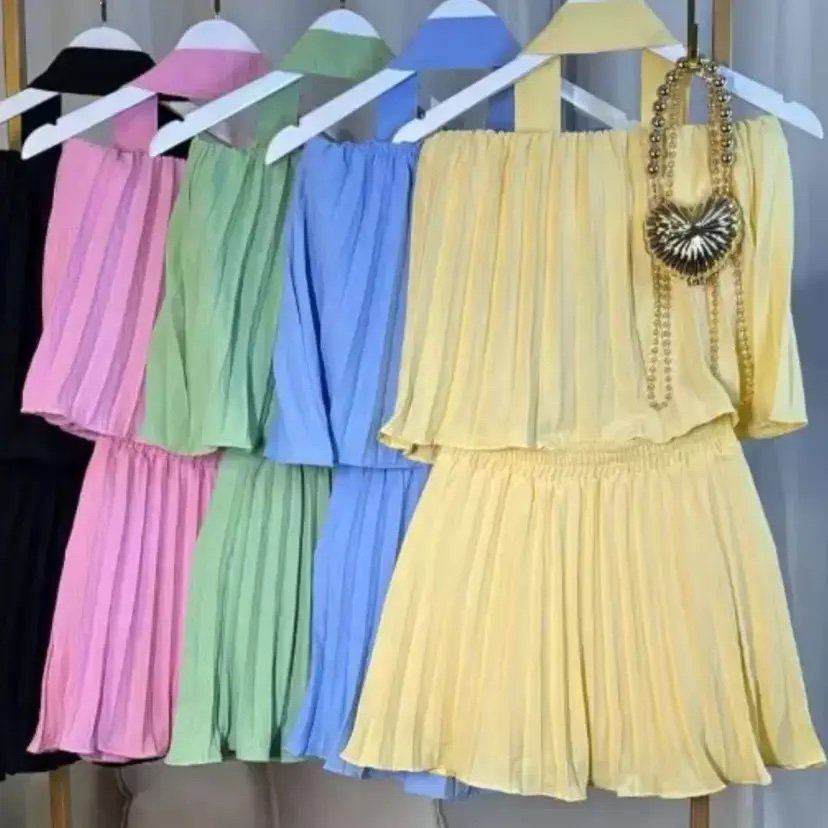 Conjunto Zaruk cropped tomara que caia e saia shorts curta plissado com faixa