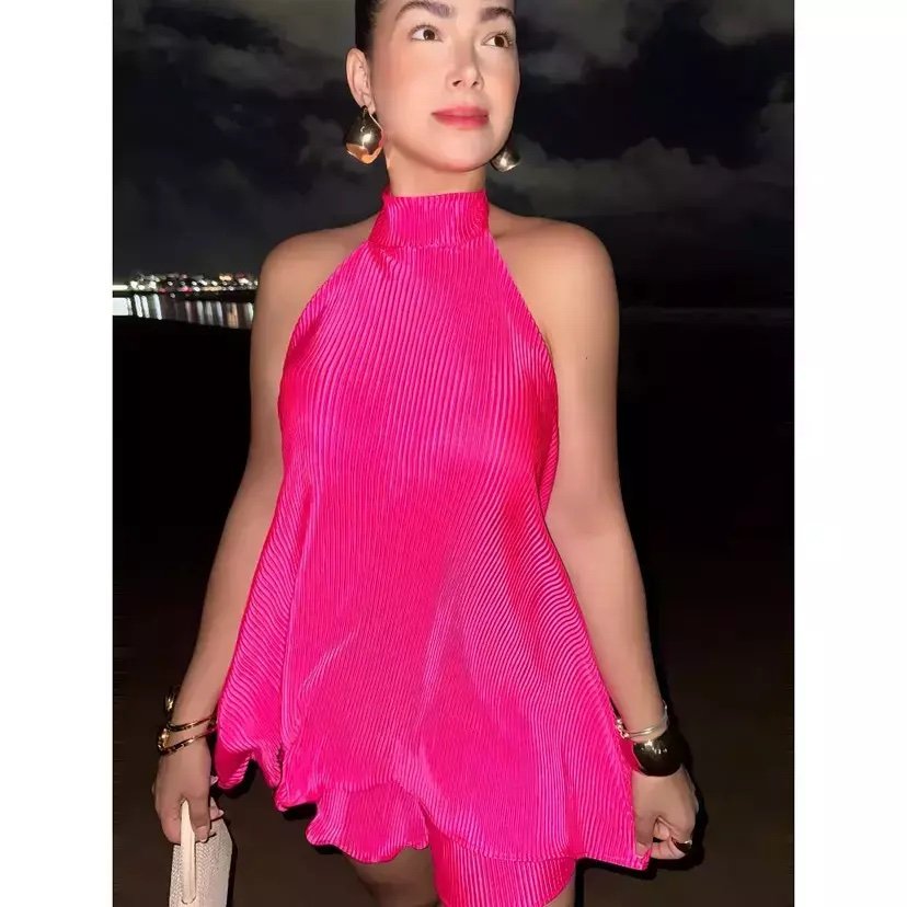 Em tecido cetim plissado.