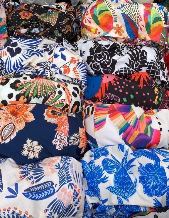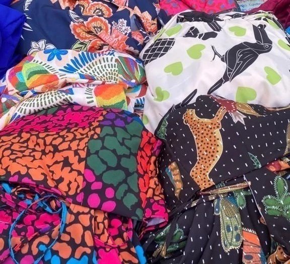 Em tecido crepe poliéster.