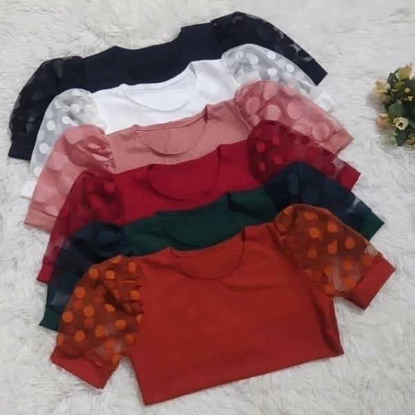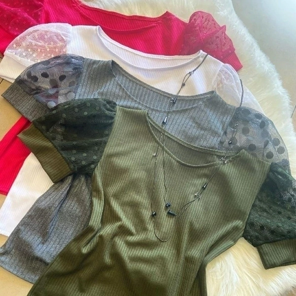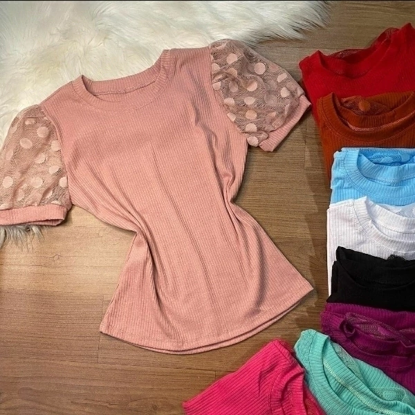Blusa manga tule em tecido malha canelada.