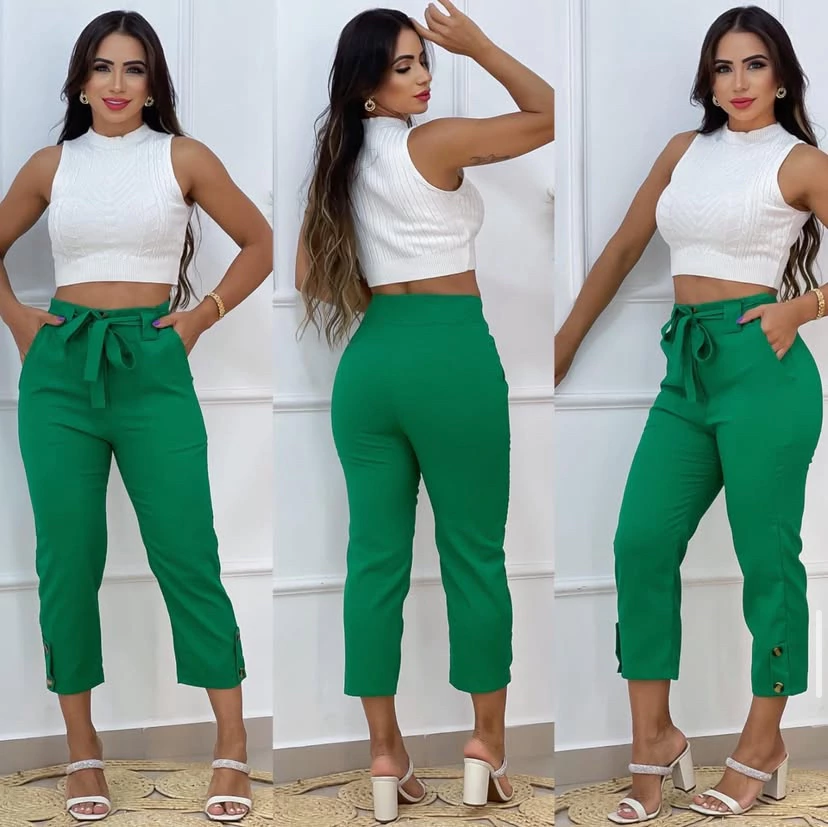 Calça Beli pantacourt detalhes em botão e cinto faixa linhão