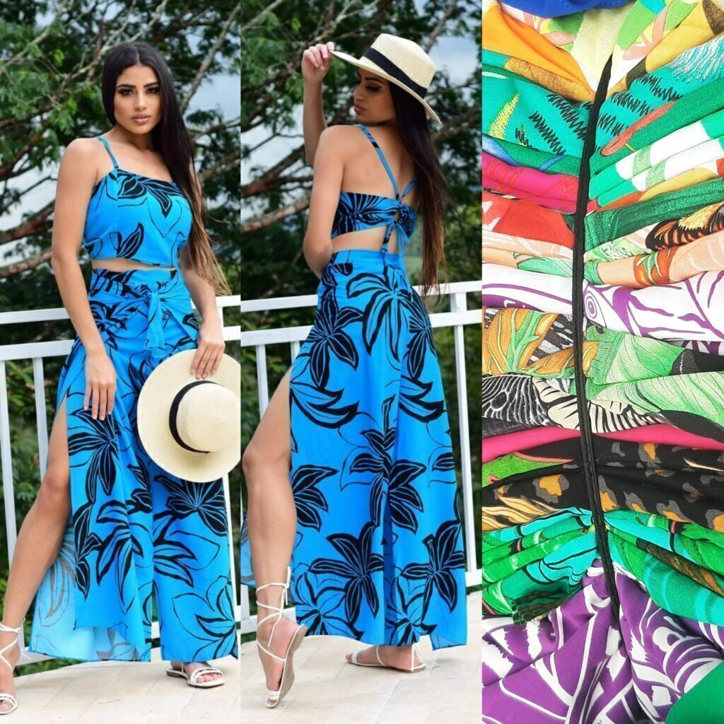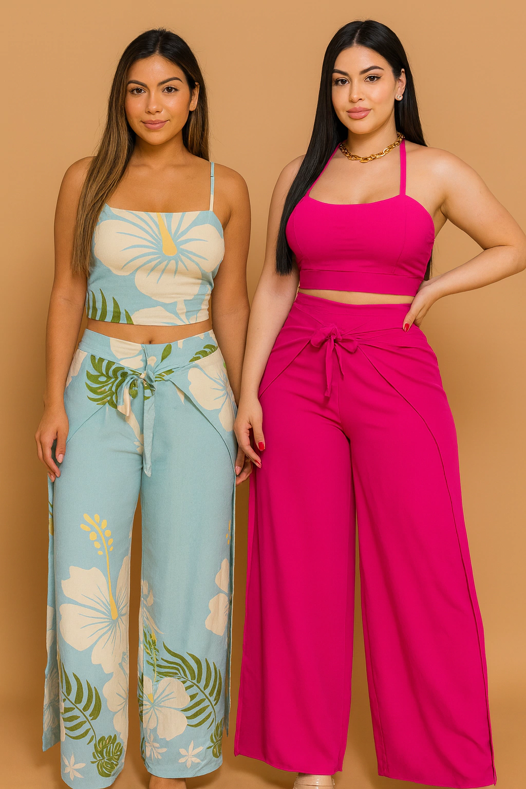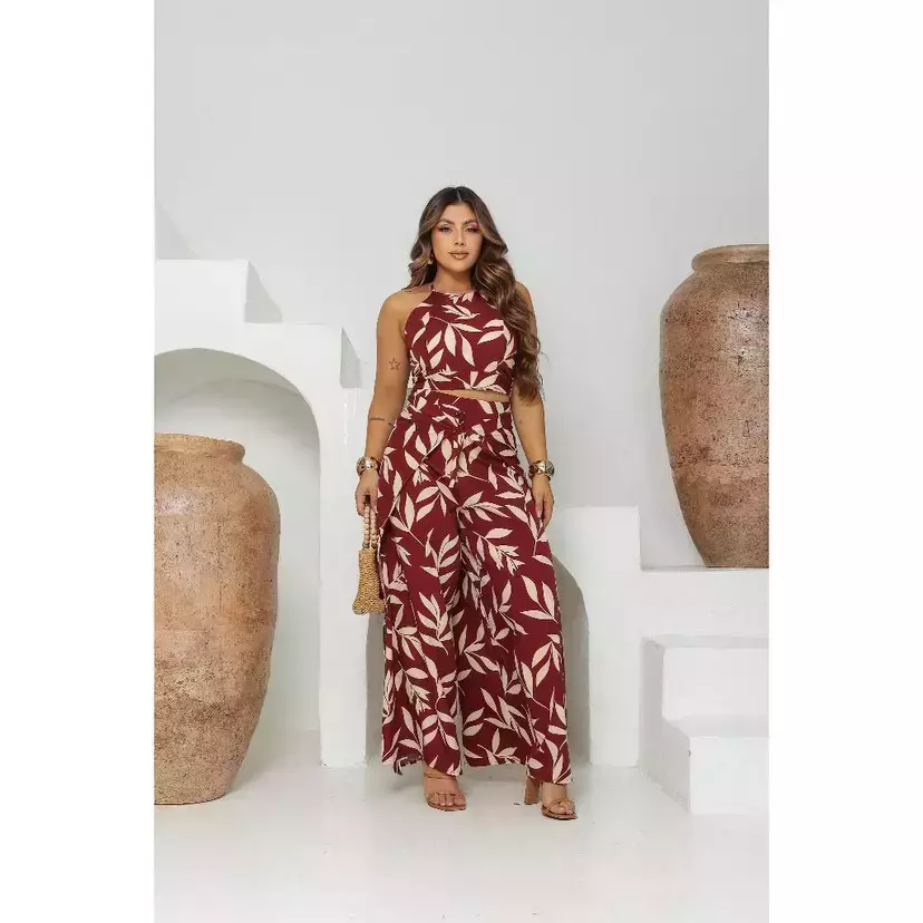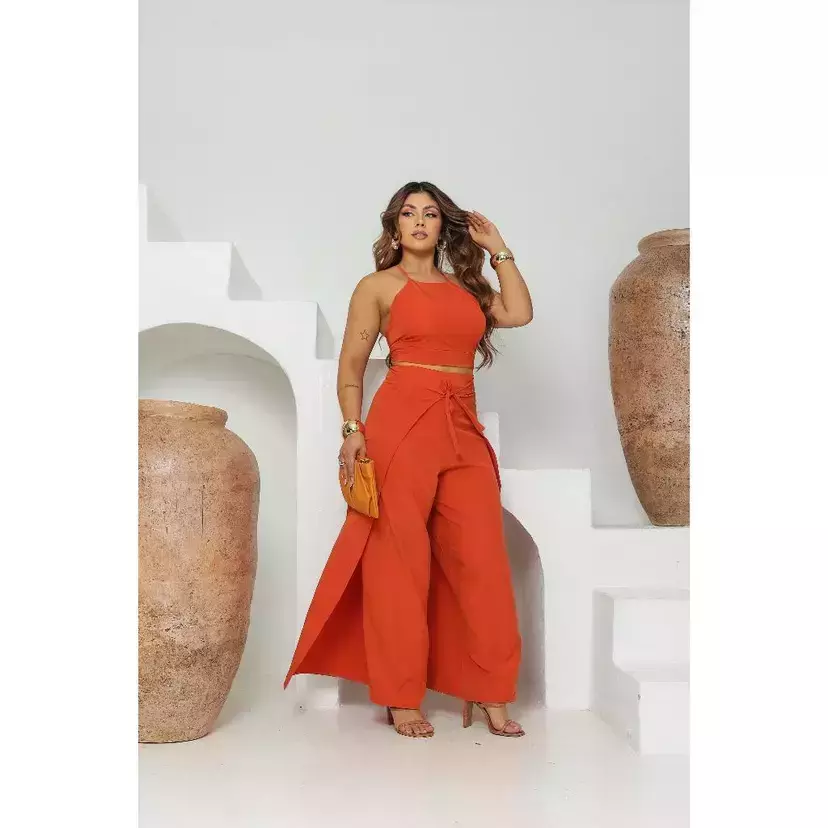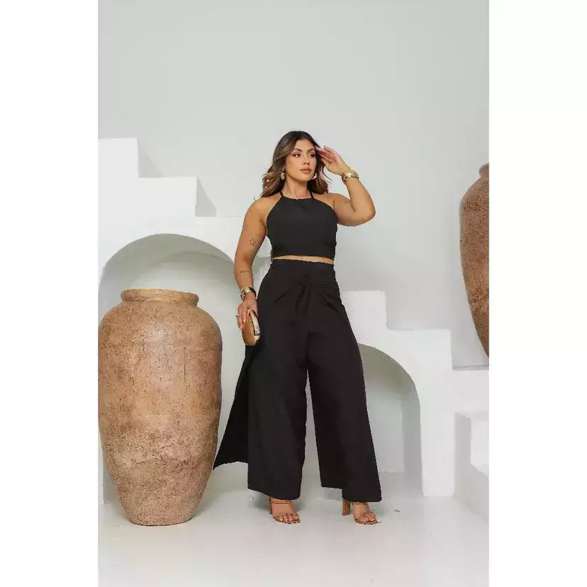 Conjunto cropped alça fina amarração nas costas e calça pantalona envelope