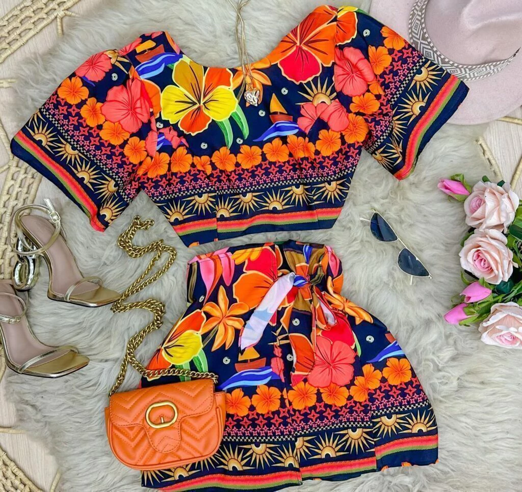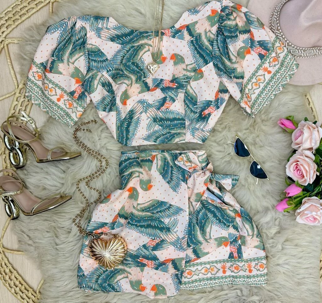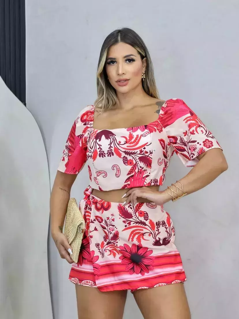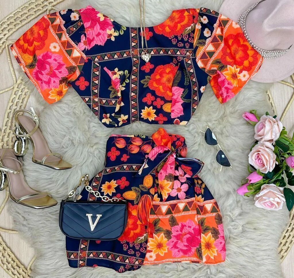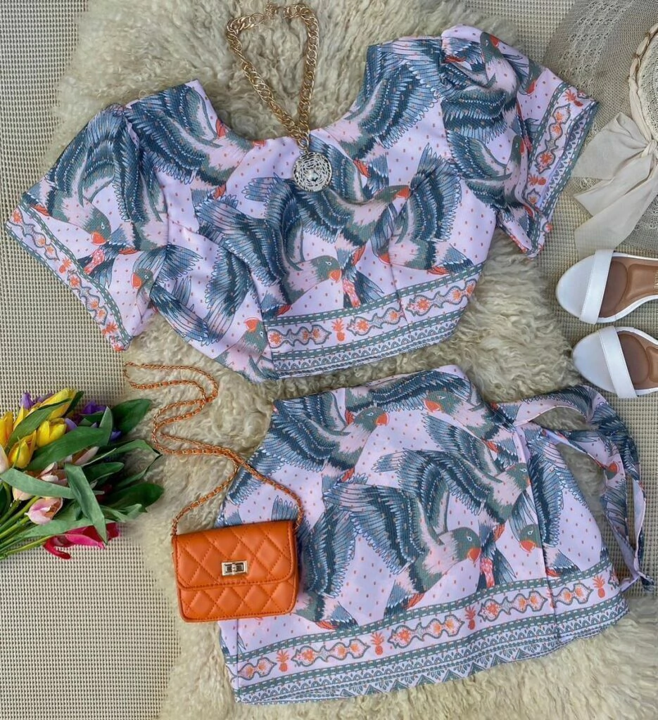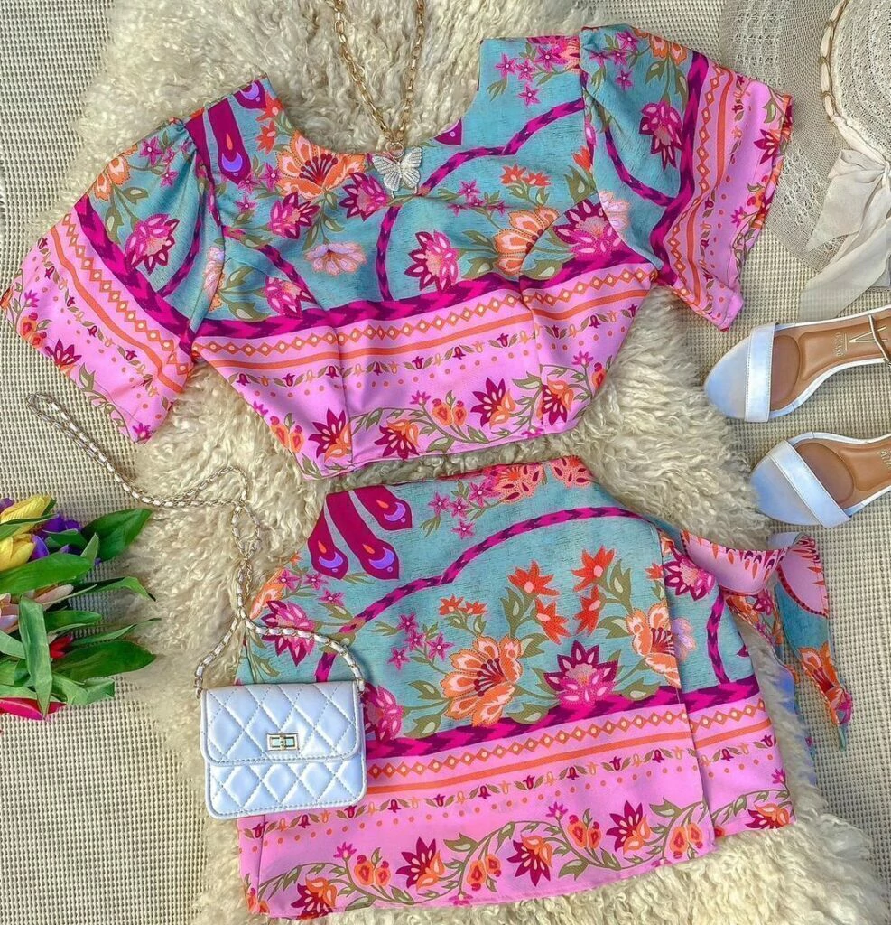 Conjunto cropped manga curta e shorts saia inspiração Farm