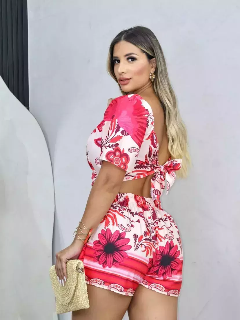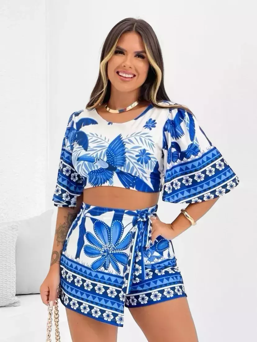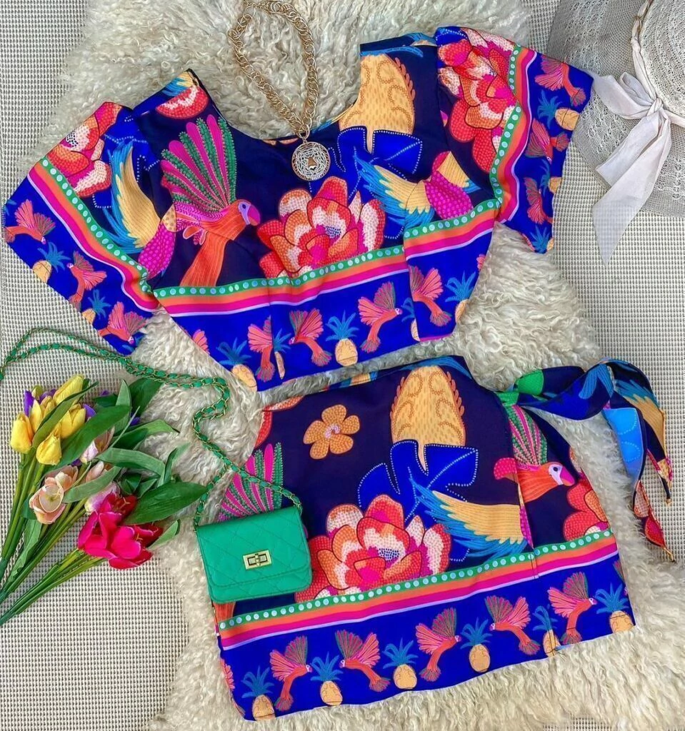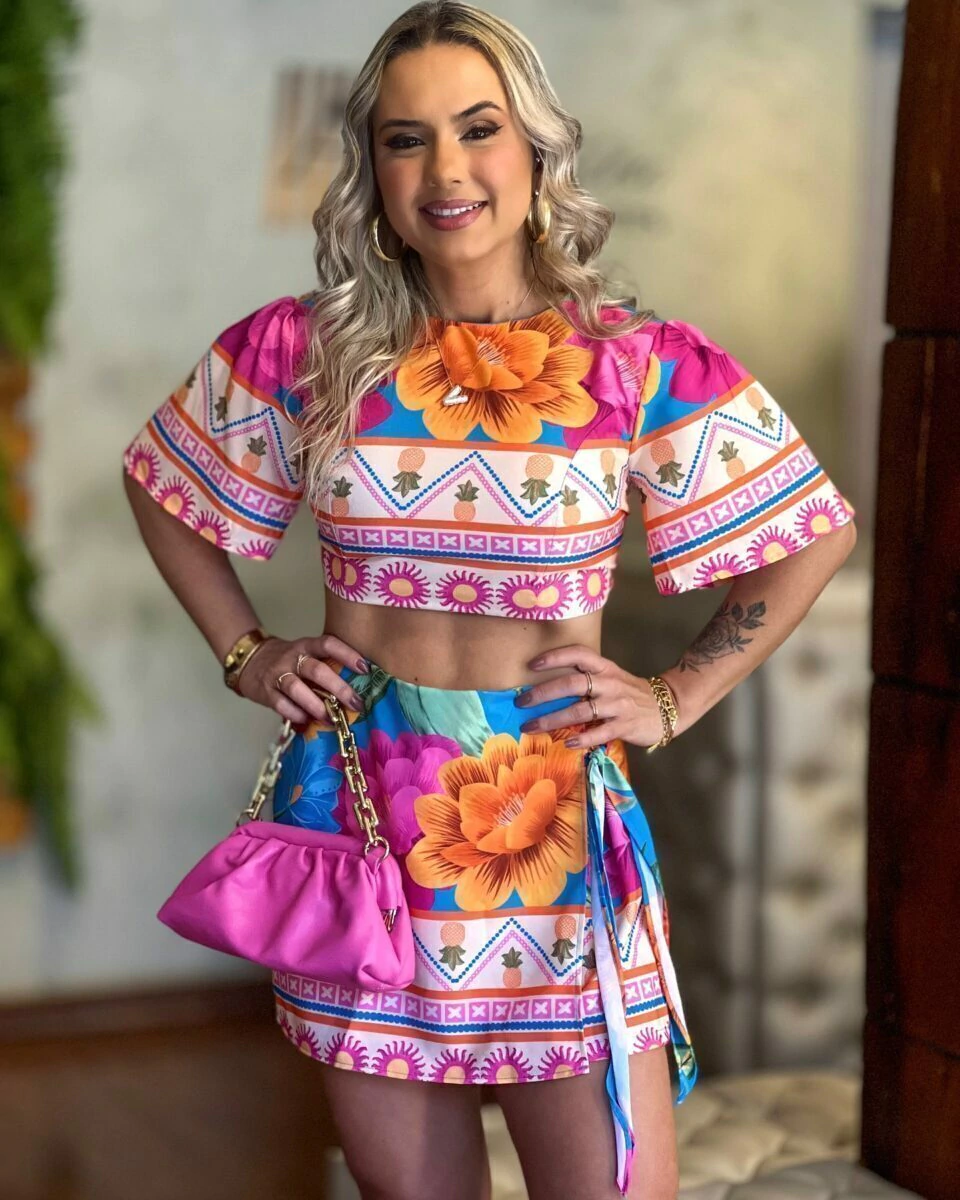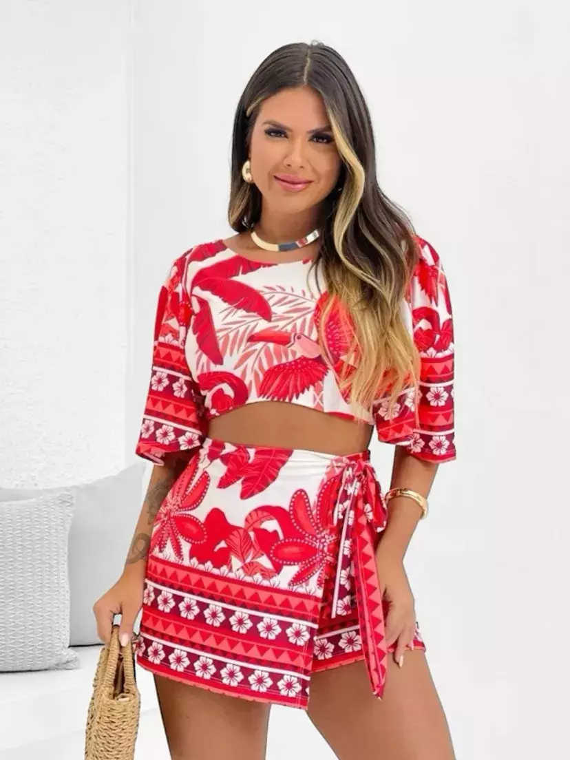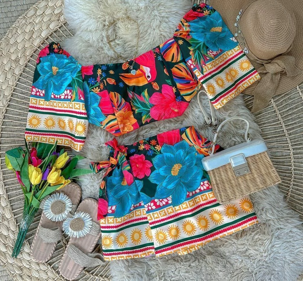 Conjunto cropped manga curta e shorts saia inspiração Farm