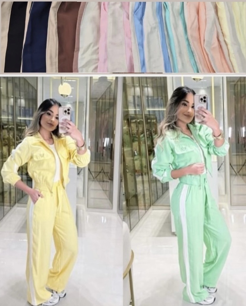 Conjunto Ian eurolook jaqueta zíper detalhes no bolso e calça pantalona faixa estilo Adidas alfaiataria