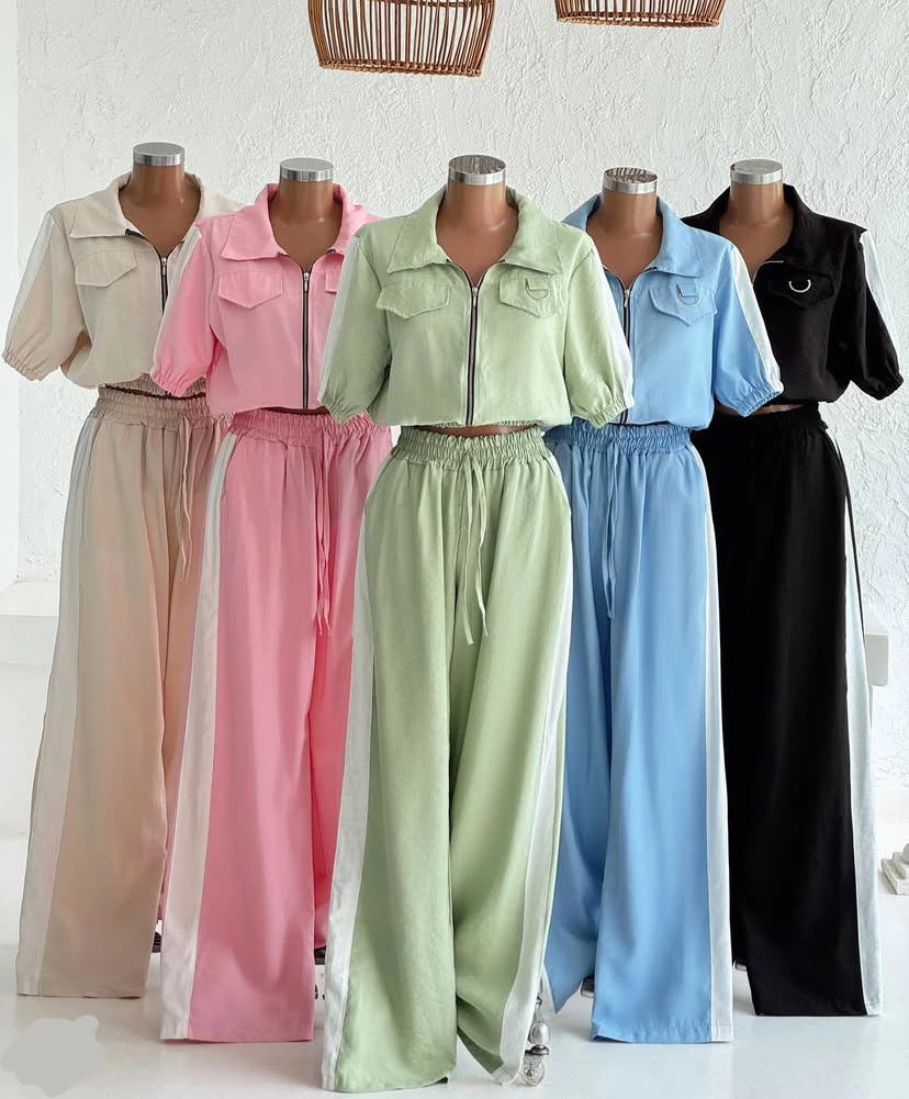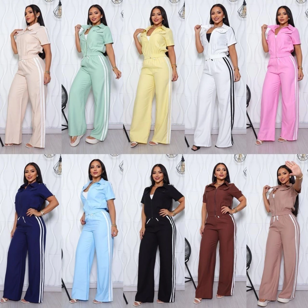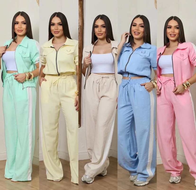Conjunto Ian eurolook jaqueta zíper manga curta detalhes no bolso e calça pantalona faixa estilo Adidas alfaiataria