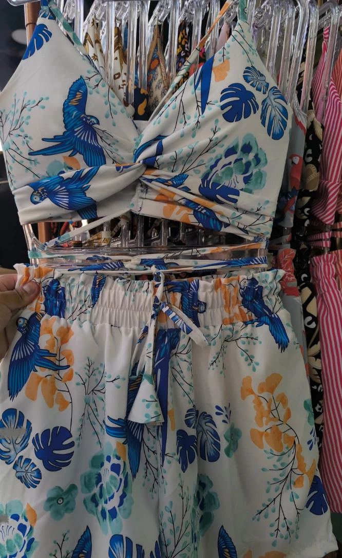 Conjunto Jhes cropped alça fina decote nó e shorts elástico estampado estilo Farm