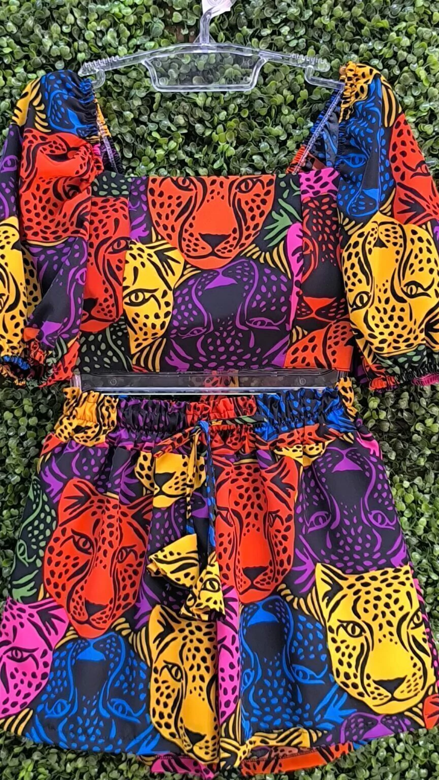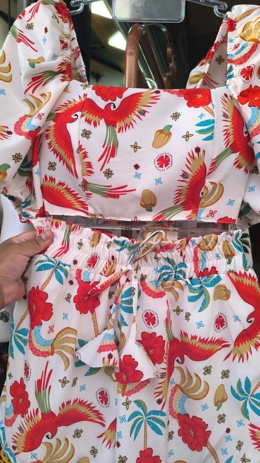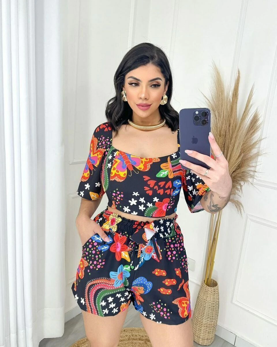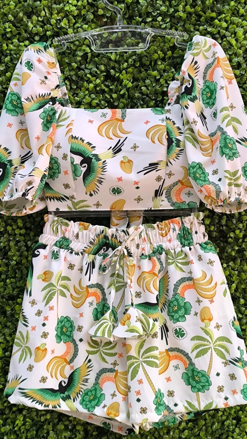 Conjunto Jhes cropped manga bufante shorts elástico estampado estilo Farm