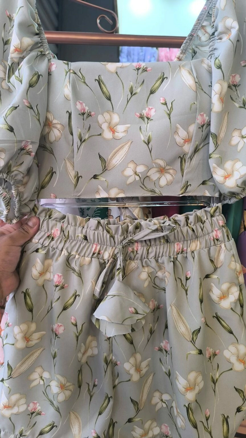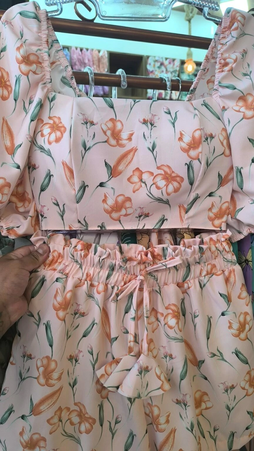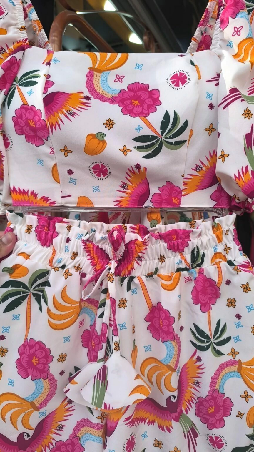 Conjunto Jhes cropped manga bufante shorts elástico estampado estilo Farm