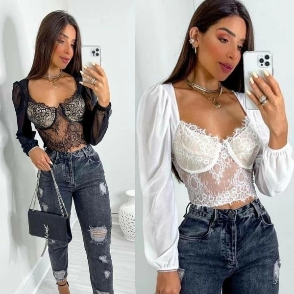 Em tecido renda e tule poliamida.