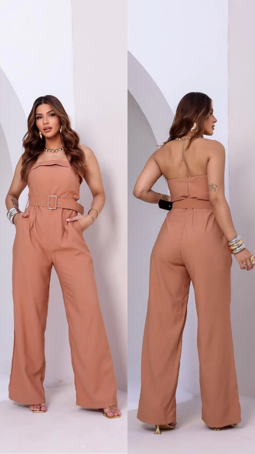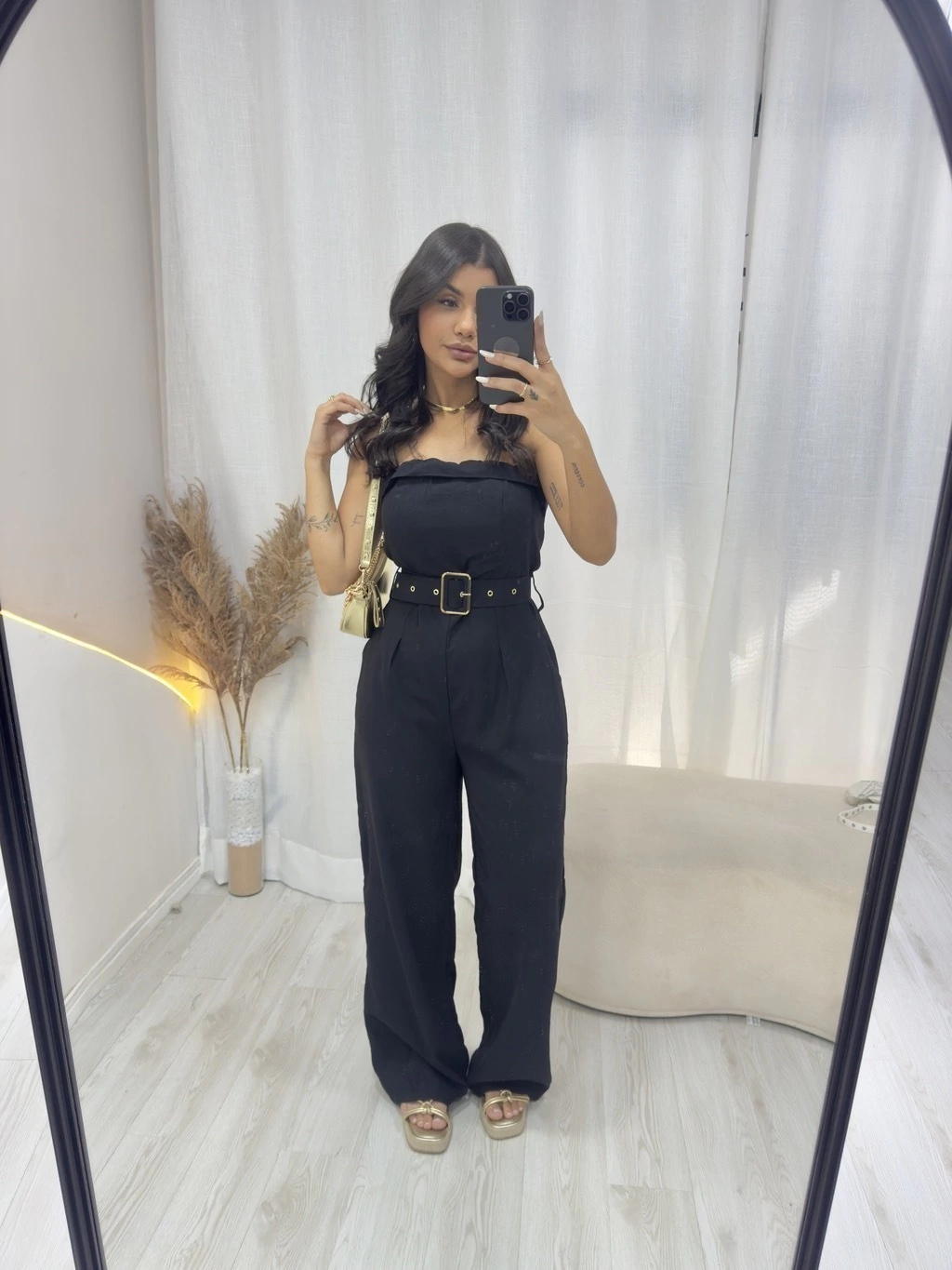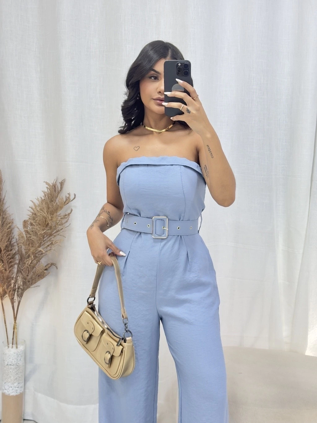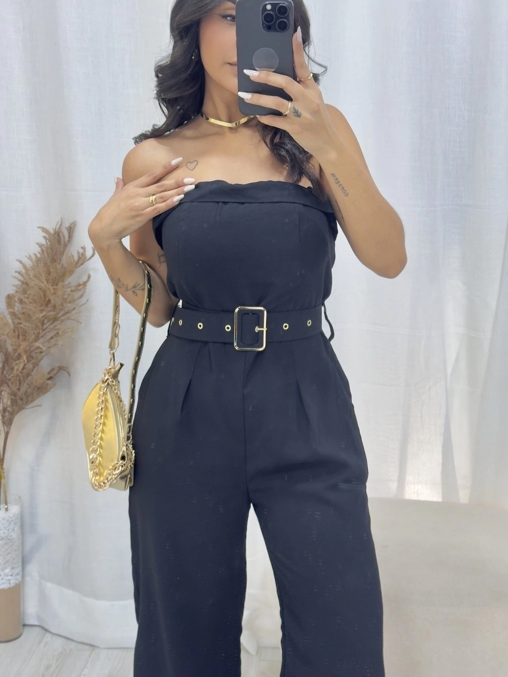 Macacão e macaquinho May tomara que caia pantalona com cinto encapado alfaiataria