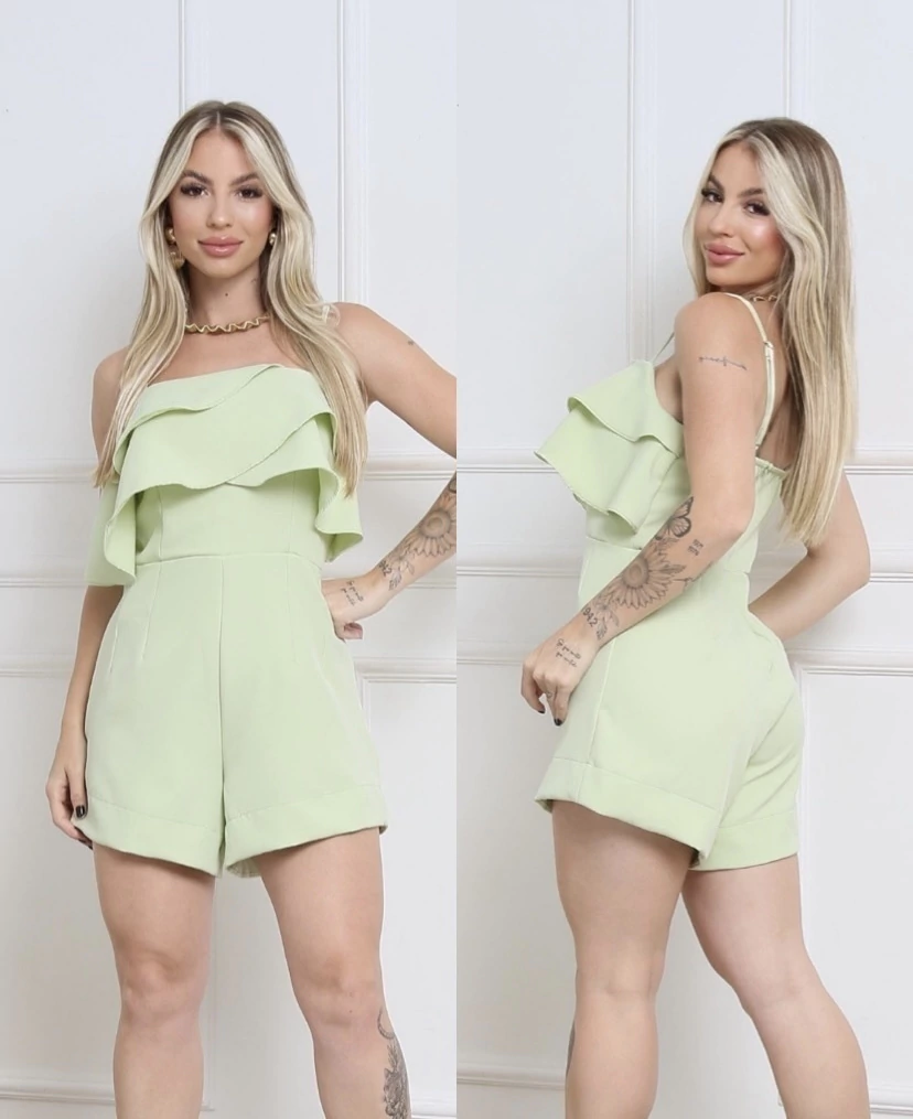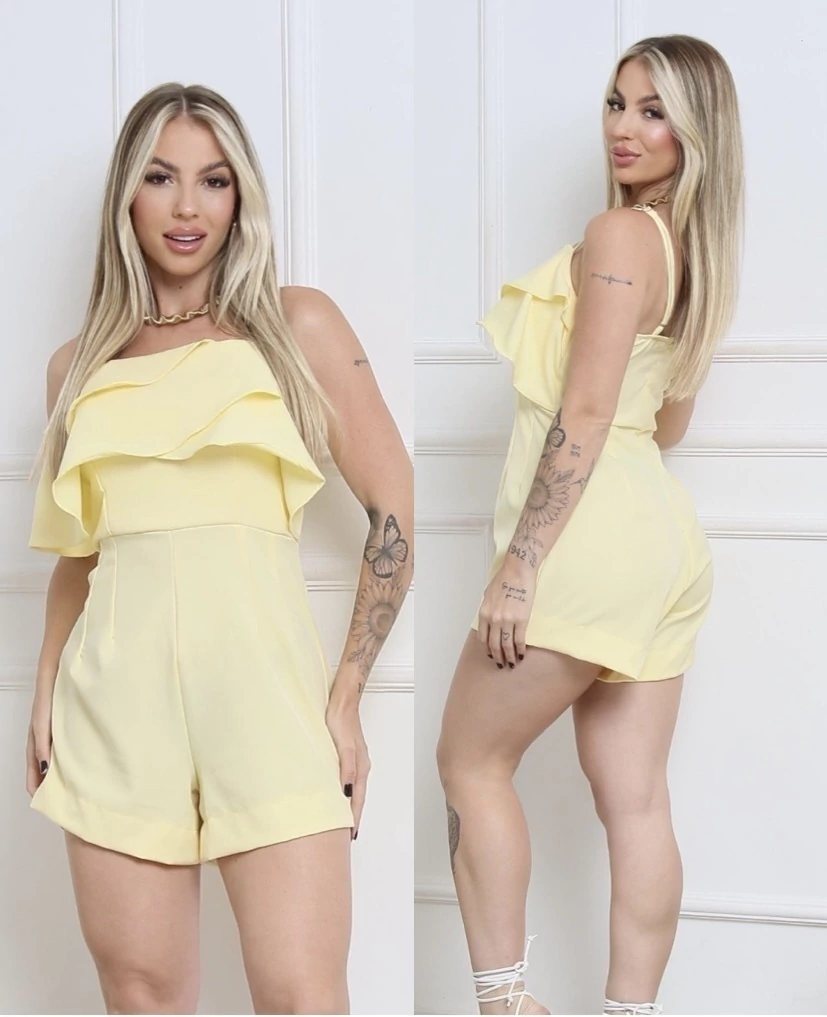 Macaquinho Marcela alça fina decote babado alfaiataria