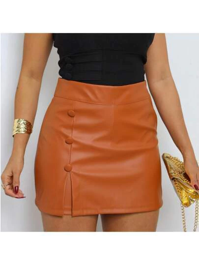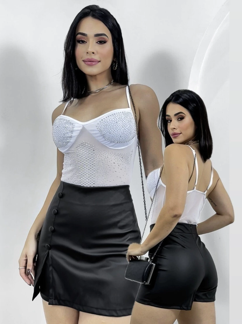 Shorts saia ziper lateral em tecido couro fake .