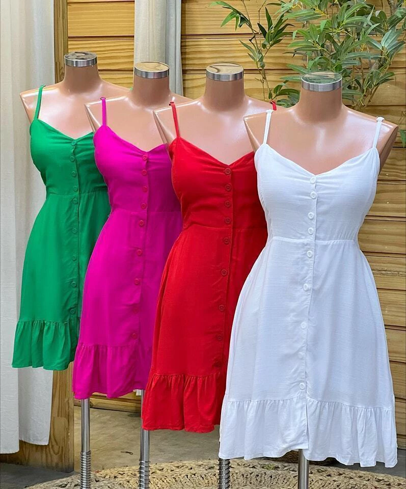Vestido curto alça fina botão liso poá onça