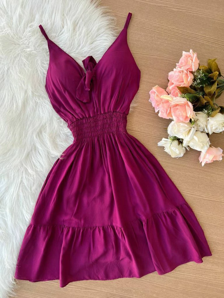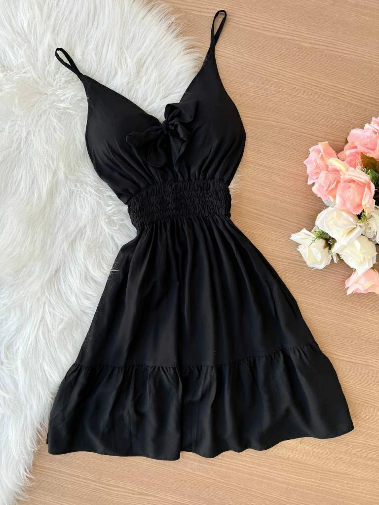 Vestido Lu curto regata alça decote laço cintura lastex liso estampado poá