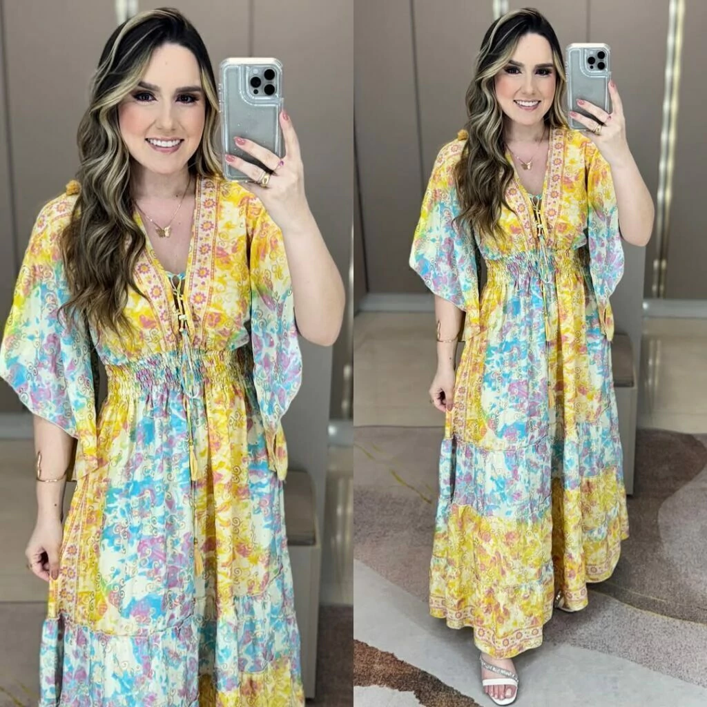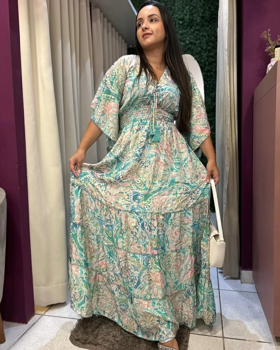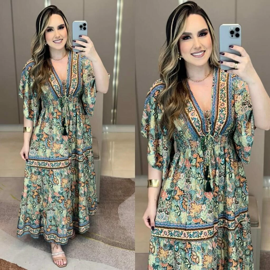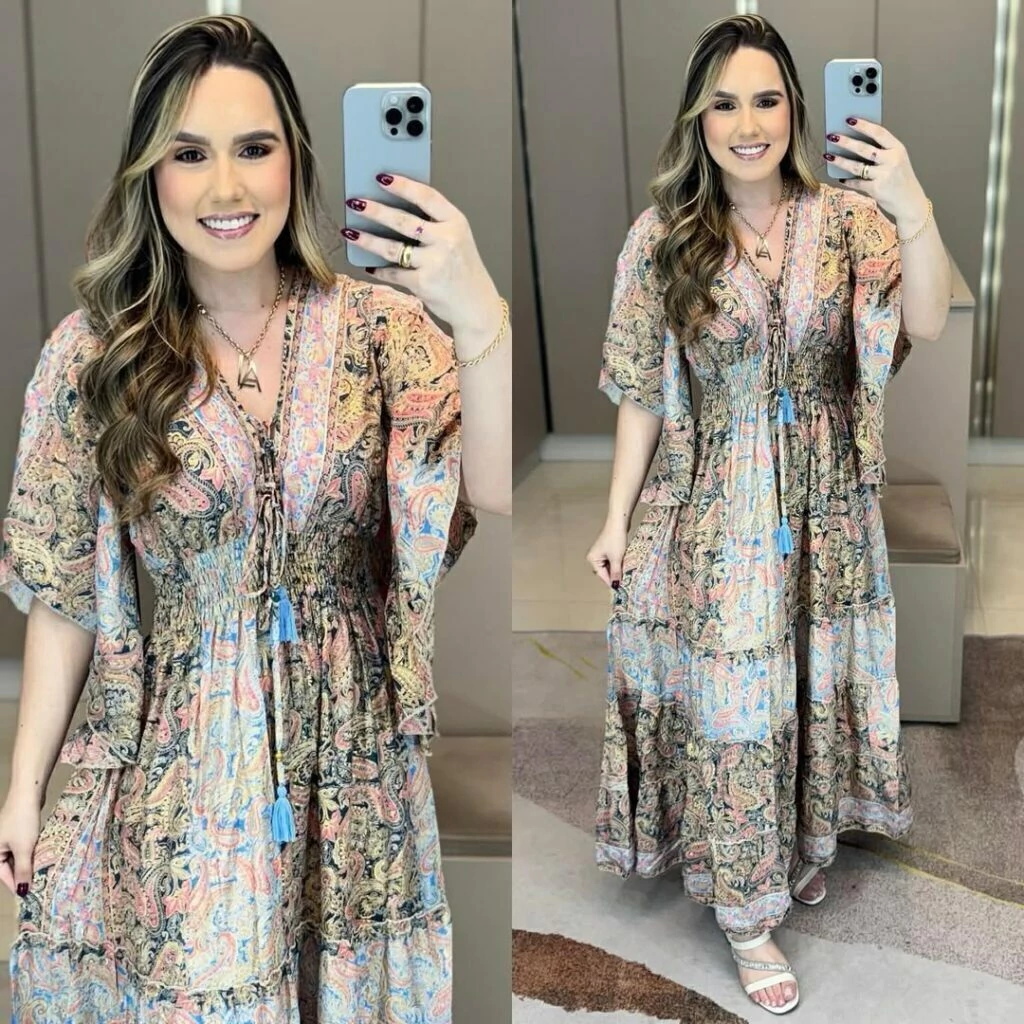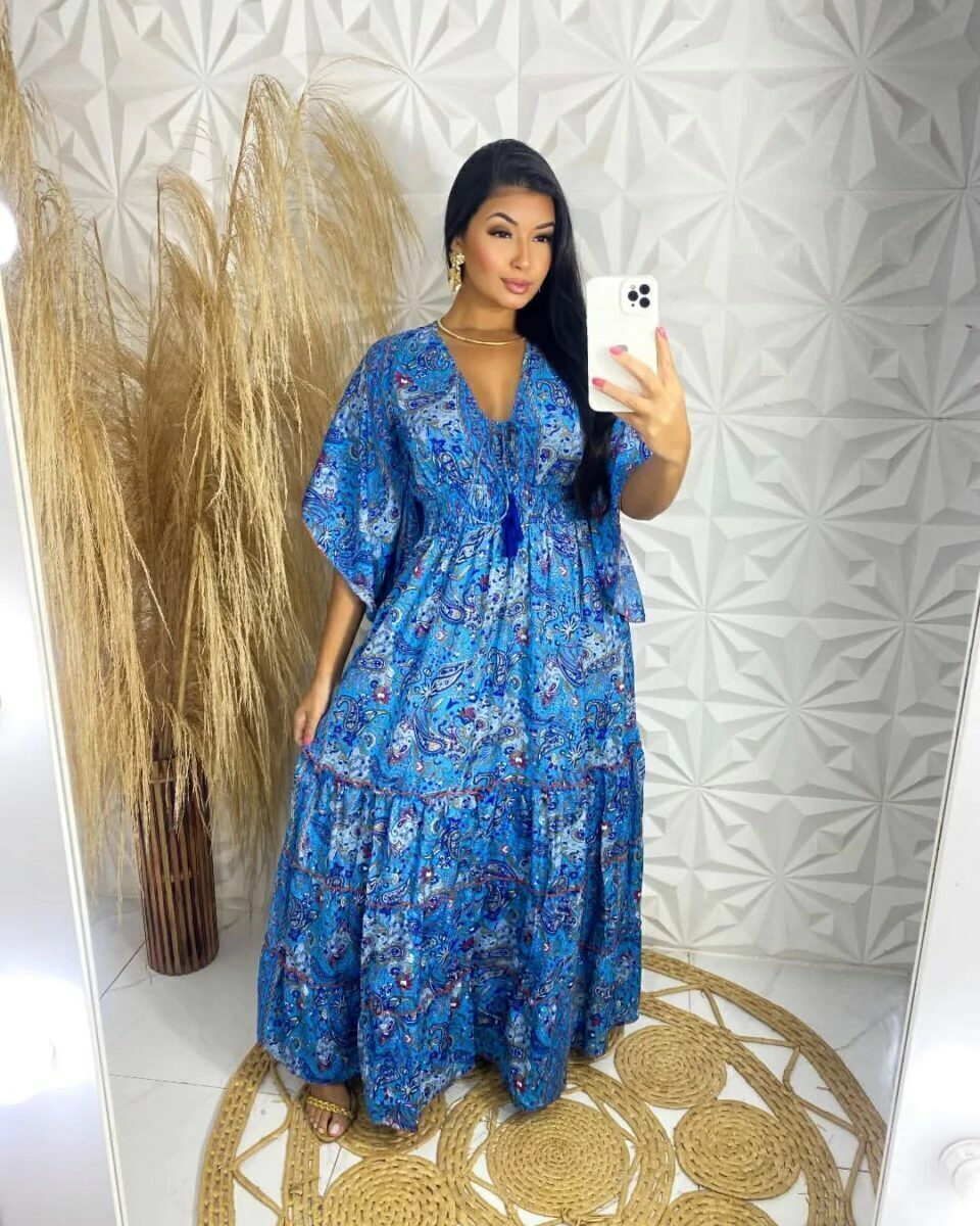 Vestido indiano boho chic manga curta flarê ajuste no decote