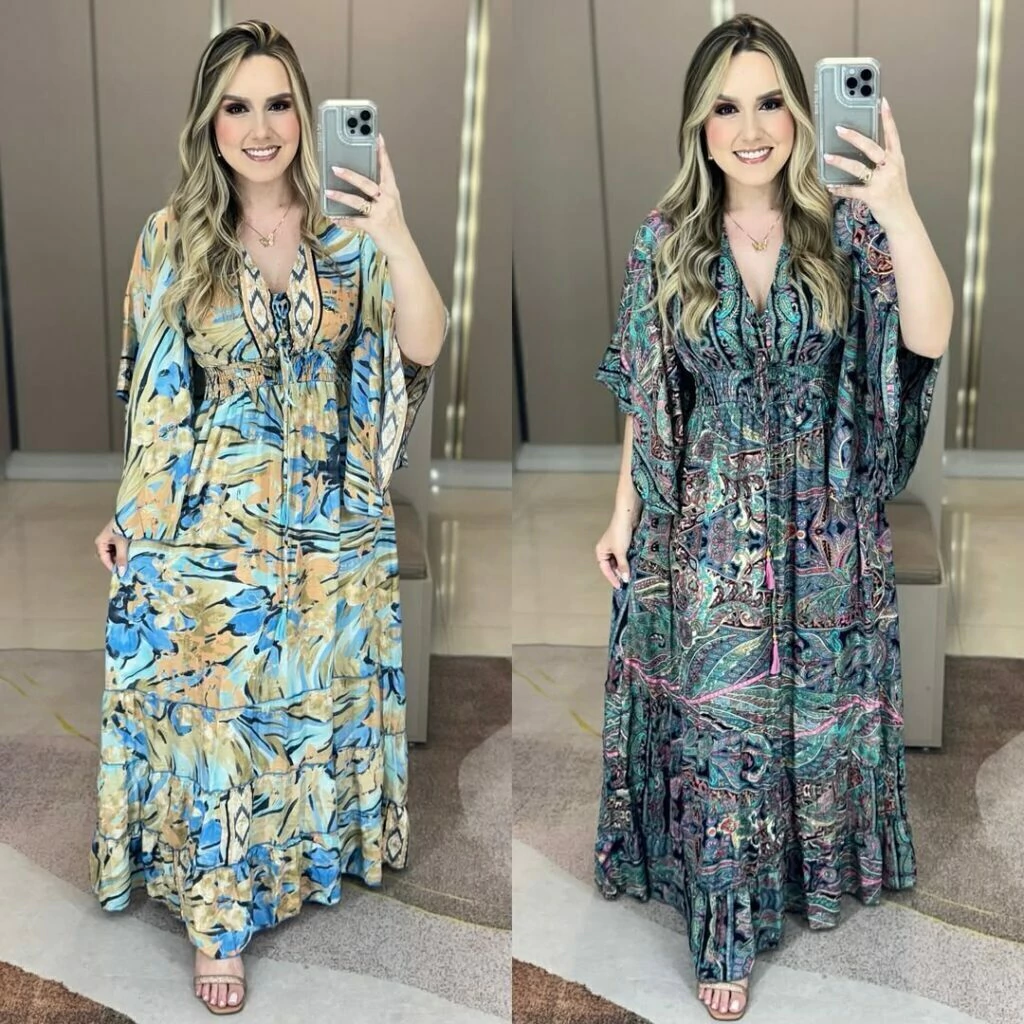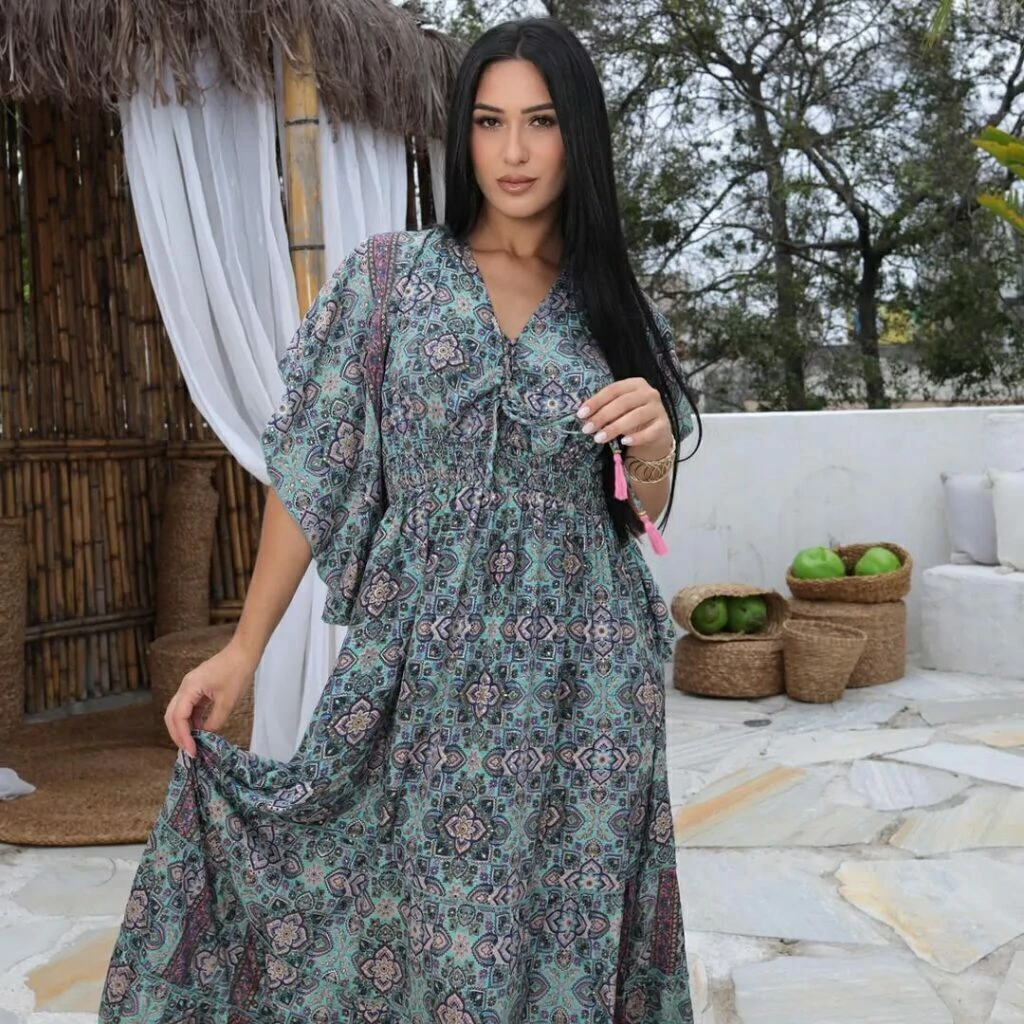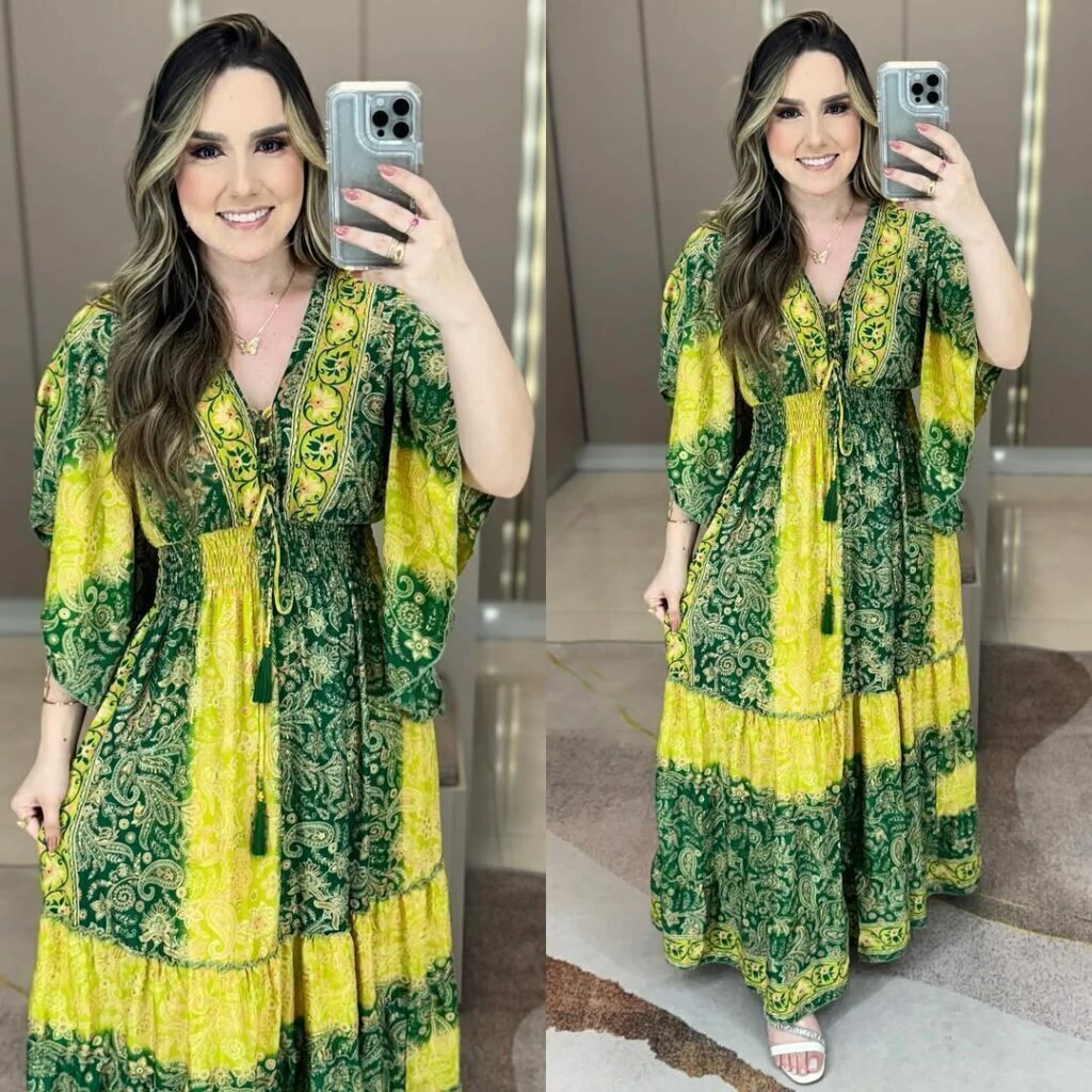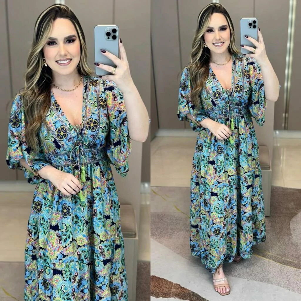 Vestido indiano boho chic manga curta flarê ajuste no decote