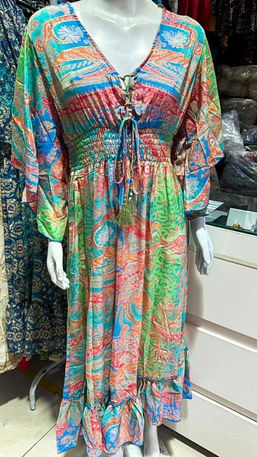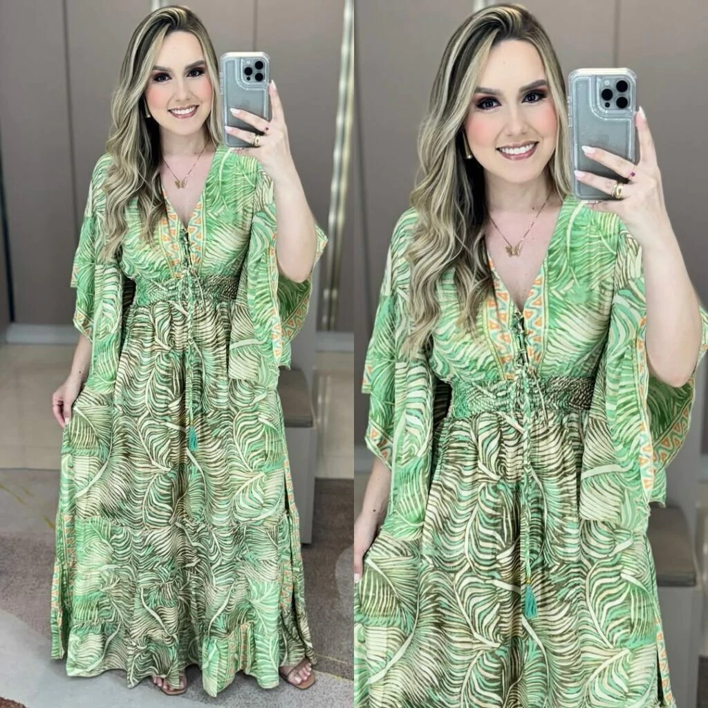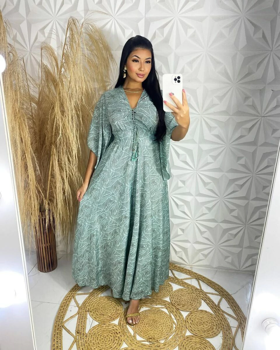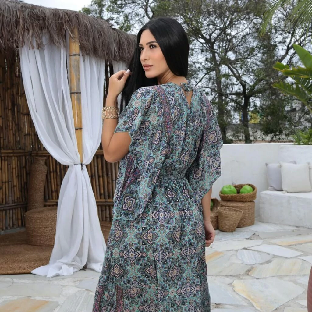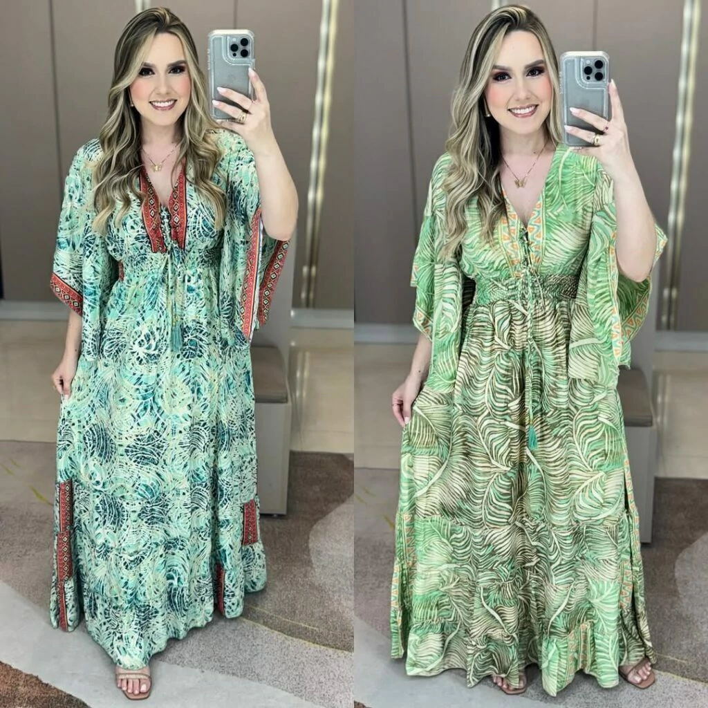 Vestido indiano boho chic manga curta flarê ajuste no decote