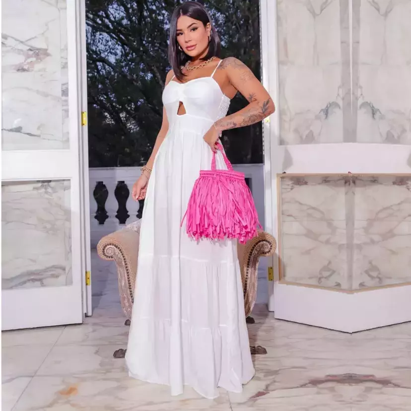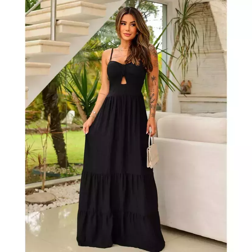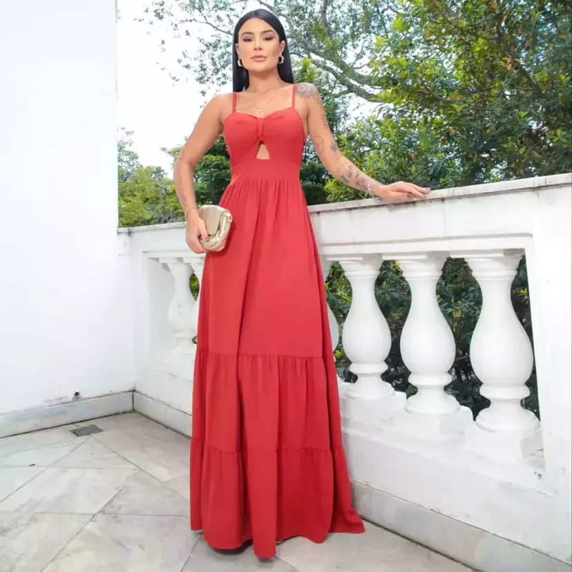 Vestido longo regata alça fina decote nó